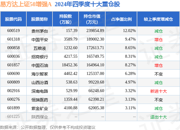 易方达上证50增强A的前十大重仓股如下: