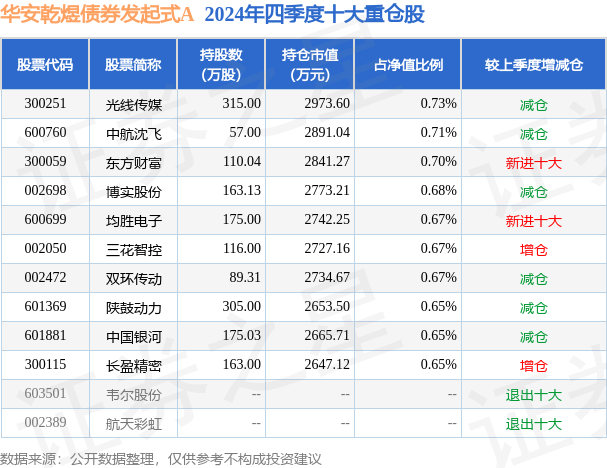 根据2024基金年报公募基金重仓股数据,重仓该股的公募基金共8家,其中持有数量最多的公募基金为华安基金的华安乾煜债券发起式A。华安乾煜债券发起式A目前规模为22.41亿元,最新净值1.1344(3月18日),较上一交易日下跌0.01%,近一年上涨7.79%。该公募基金现任基金经理为魏媛媛 郑伟山 邹维娜。邹维娜在任的基金产品包括:华安添锦债券,管理时间为2023年1月4日至今,期间收益率为5.84%;华安沣信债券A,管理时间为2023年7月18日至今,期间收益率为8.02%。魏媛媛在任的基金产品包括:华安信用四季红债券A,管理时间为2021年8月16日至今,期间收益率为11.51%;华安顺穗债券,管理时间为2021年12月16日至今,期间收益率为10.08%;华安添锦债券,管理时间为2022年6月15日至今,期间收益率为6.97%。郑伟山在任的基金产品包括:华安新乐享灵活配置混合A,管理时间为2022年5月25日至今,期间收益率为9.12%;华安强化收益债券A,管理时间为2022年9月16日至今,期间收益率为21.28%;华安添颐混合A,管理时间为2023年3月23日至今,期间收益率为7.39%。