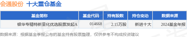 根据2024基金年报公募基金重仓股数据,重仓该股的公募基金共1家,其中持有数量最多的公募基金为银华基金的银华专精特新量化优选股票发起A。银华专精特新量化优选股票发起A目前规模为0.19亿元,最新净值1.1562(3月18日),较上一交易日上涨0.82%,近一年上涨32.15%。该公募基金现任基金经理为杨腾。杨腾在任的基金产品包括:银华新能源新材料A,管理时间为2021年11月29日至今,期间收益率为-47.34%;银华食品饮料量化股票发起式A,管理时间为2021年11月29日至今,期间收益率为-27.83%;银华医疗健康量化优选A,管理时间为2021年11月29日至今,期间收益率为-38.92%;银华稳健增利灵活配置混合A,管理时间为2021年11月29日至今,期间收益率为-11.48%。