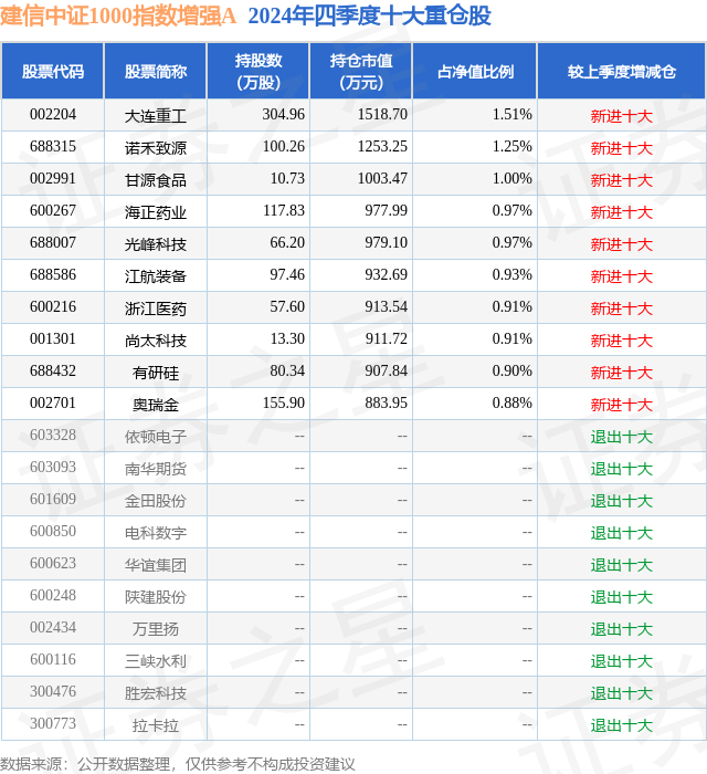 建信中证1000指数增强A的前十大重仓股如下: