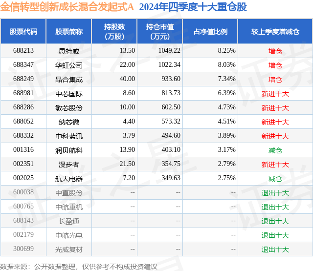 金信转型创新成长混合发起式A的前十大重仓股如下: