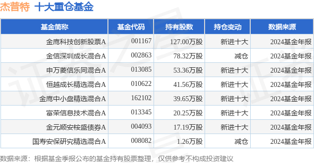 根据2024基金年报公募基金重仓股数据,重仓该股的公募基金共8家,其中持有数量最多的公募基金为金鹰基金的金鹰科技创新股票A。金鹰科技创新股票A目前规模为17.79亿元,最新净值1.65(3月19日),较上一交易日下跌1.6%,近一年上涨40.41%。该公募基金现任基金经理为陈颖。陈颖在任的基金产品包括:金鹰核心资源混合A,管理时间为2019年1月26日至今,期间收益率为199.72%;金鹰红利价值混合A,管理时间为2020年4月28日至今,期间收益率为148.0%;金鹰科技致远混合A,管理时间为2024年3月19日至今,期间收益率为60.38%。