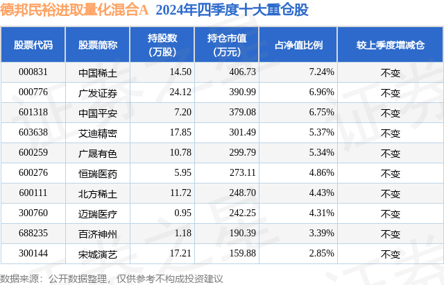 德邦民裕进取量化混合A的前十大重仓股如下: