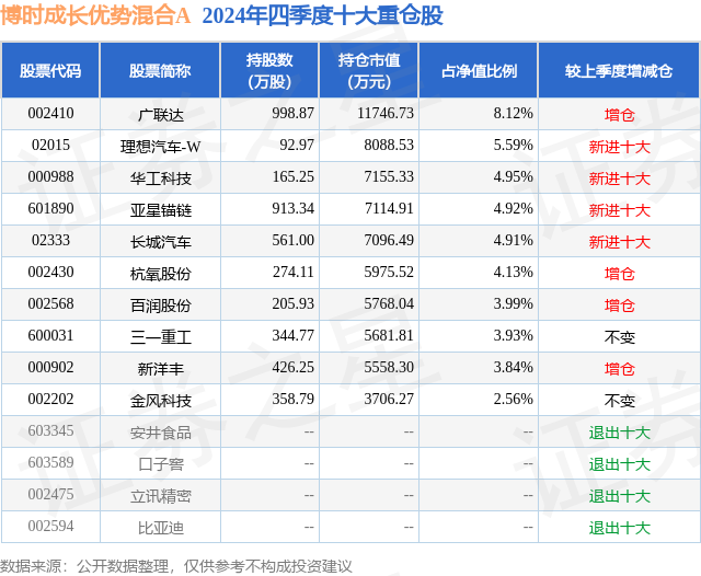 博时成长优势混合A的前十大重仓股如下: