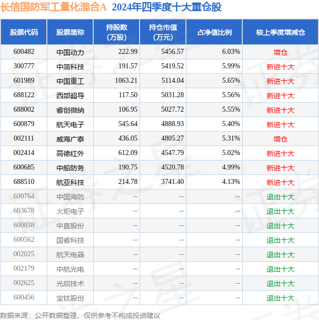 长信国防军工量化混合A的前十大重仓股如下:
