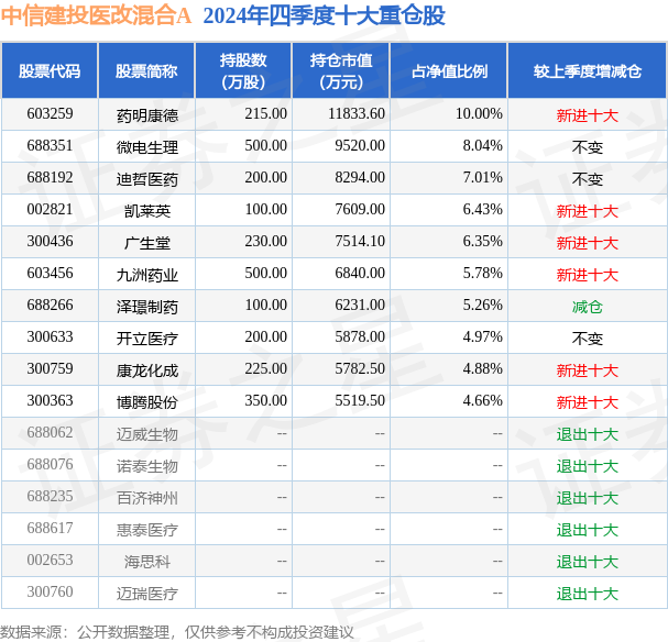 中信建投医改混合A的前十大重仓股如下: