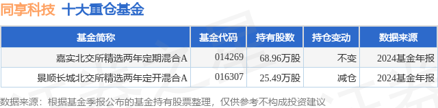 根据2024基金年报公募基金重仓股数据,重仓该股的公募基金共2家,其中持有数量最多的公募基金为嘉实基金的嘉实北交所精选两年定期混合A。嘉实北交所精选两年定期混合A目前规模为2.32亿元,最新净值0.8894(3月28日),较上一交易日下跌1.96%,近一年上涨46.6%。该公募基金现任基金经理为刘杰 李涛。刘杰在任的基金产品包括:嘉实先进制造股票,管理时间为2021年5月27日至今,期间收益率为-22.41%;嘉实全球产业升级股票发起式(QDII)A,管理时间为2023年2月9日至今,期间收益率为57.1%;嘉实碳中和主题混合A,管理时间为2023年3月31日至今,期间收益率为23.37%。李涛在任的基金产品包括:嘉实清洁能源股票发起式A,管理时间为2022年11月22日至今,期间收益率为-27.58%;嘉实积极配置一年持有混合A,管理时间为2022年11月29日至今,期间收益率为5.89%;嘉实信息产业股票发起式A,管理时间为2022年12月16日至今,期间收益率为44.1%。
