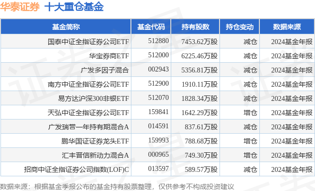 根据2024基金年报公募基金重仓股数据,重仓该股的公募基金共135家,其中持有数量最多的公募基金为国泰基金的国泰中证全指证券公司ETF。国泰中证全指证券公司ETF目前规模为283.63亿元,最新净值1.1064(3月28日),较上一交易日下跌0.06%,近一年上涨29.62%。该公募基金现任基金经理为艾小军。艾小军在任的基金产品包括:国泰上证180金融ETF联接A,管理时间为2014年1月13日至今,期间收益率为147.77%;国泰上证180金融ETF,管理时间为2014年1月13日至今,期间收益率为163.8%;国泰黄金ETF,管理时间为2014年1月13日至今,期间收益率为183.26%;国泰中证计算机主题ETF联接A,管理时间为2015年3月26日至今,期间收益率为-8.81%。
