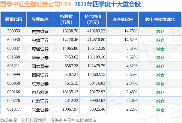 国泰中证全指证券公司ETF的前十大重仓股如下: