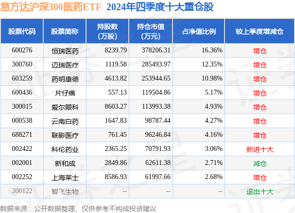 根据2024基金年报公募基金重仓股数据,重仓该股的公募基金共134家,其中持有数量最多的公募基金为易方达基金的易方达沪深300医药ETF。易方达沪深300医药ETF目前规模为231.22亿元,最新净值0.3629(3月31日),较上一交易日下跌0.71%,近一年上涨0.08%。该公募基金现任基金经理为余海燕。余海燕在任的基金产品包括:易方达沪深300非银ETF,管理时间为2014年6月26日至今,期间收益率为132.38%;易方达沪深300非银联接A,管理时间为2015年1月22日至今,期间收益率为4.78%;易方达沪深300ETF联接A,管理时间为2016年4月16日至今,期间收益率为46.41%。