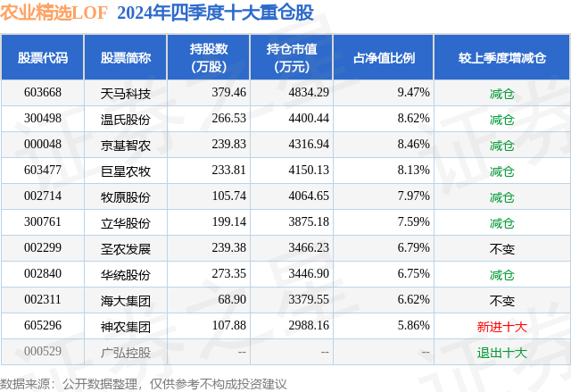 农业精选LOF的前十大重仓股如下: