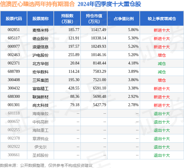 信澳匠心臻选两年持有期混合的前十大重仓股如下: