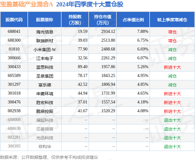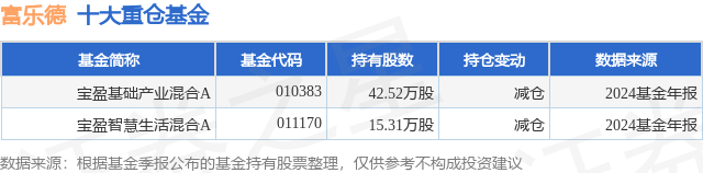 根据2024基金年报公募基金重仓股数据,重仓该股的公募基金共2家,其中持有数量最多的公募基金为宝盈基金的宝盈基础产业混合A。宝盈基础产业混合A目前规模为3.24亿元,最新净值0.9751(4月7日),较上一交易日下跌10.72%,近一年上涨26.6%。该公募基金现任基金经理为张天闻。张天闻在任的基金产品包括:宝盈半导体产业混合发起式A,管理时间为2022年12月5日至今,期间收益率为33.95%;宝盈人工智能股票A,管理时间为2023年4月15日至今,期间收益率为12.83%;宝盈智慧生活混合A,管理时间为2023年4月15日至今,期间收益率为10.51%。