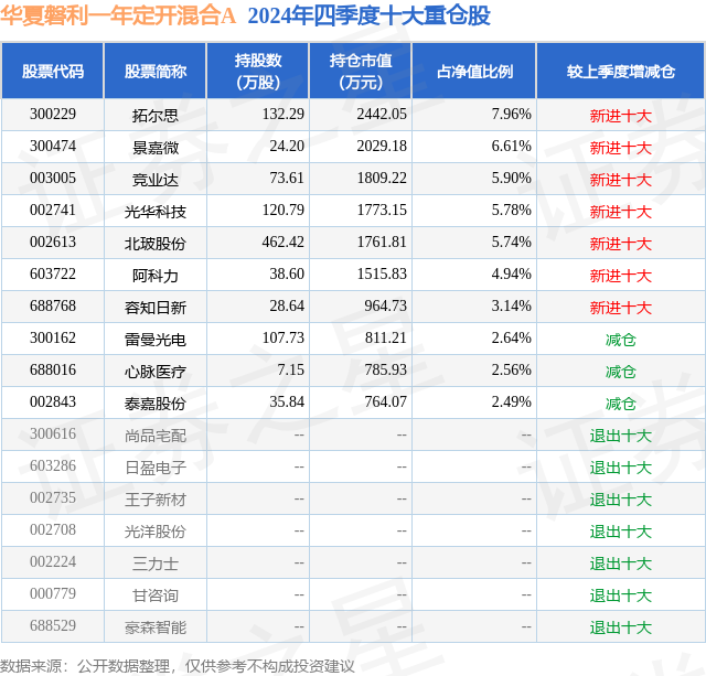 华夏磐利一年定开混合A的前十大重仓股如下: