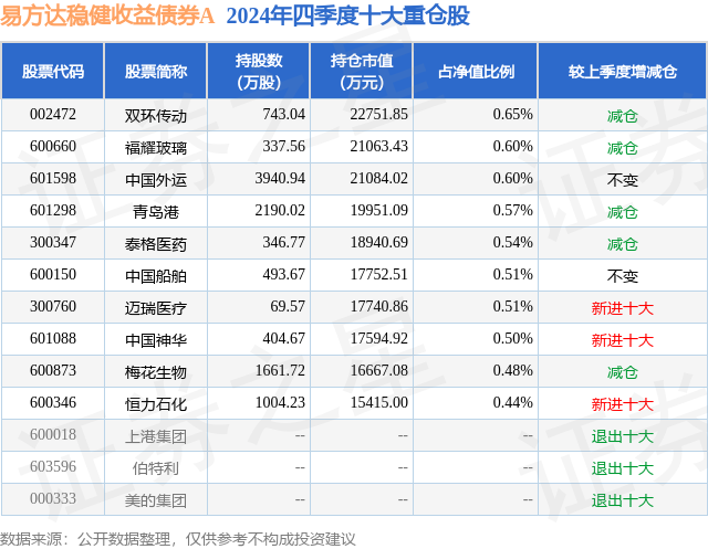 根据2024基金年报公募基金重仓股数据,重仓该股的公募基金共62家,其中持有数量最多的公募基金为易方达基金的易方达稳健收益债券A。易方达稳健收益债券A目前规模为87.83亿元,最新净值1.3691(4月9日),较上一交易日上涨0.23%,近一年上涨5.07%。该公募基金现任基金经理为胡剑。胡剑在任的基金产品包括:易方达裕惠定开混合A,管理时间为2013年12月17日至今,期间收益率为172.13%;易方达岁丰添利债券(LOF)A,管理时间为2019年1月4日至今,期间收益率为53.34%;易方达恒盛3个月定开混合,管理时间为2019年9月6日至今,期间收益率为39.78%。