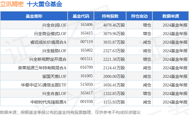 根据2024基金年报公募基金重仓股数据,重仓该股的公募基金共1062家,其中持有数量最多的公募基金为兴证全球基金的兴全合润LOF。兴全合润LOF目前规模为228.7亿元,最新净值1.4157(4月9日),较上一交易日上涨1.11%,近一年上涨4.93%。该公募基金现任基金经理为谢治宇。谢治宇在任的基金产品包括:兴全合宜混合(LOF)A,管理时间为2018年1月23日至今,期间收益率为33.58%;兴全社会价值三年持有混合,管理时间为2019年12月26日至今,期间收益率为35.66%;兴全合润混合C,管理时间为2025年4月8日至今,期间收益率为0.0%。