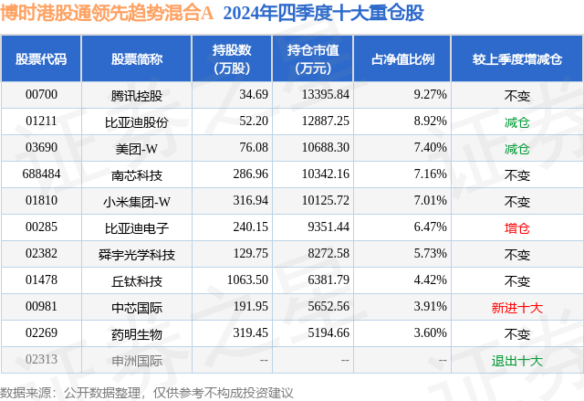 根据2024基金年报公募基金重仓股数据,重仓该股的公募基金共6家,其中持有数量最多的公募基金为博时基金的博时港股通领先趋势混合A。博时港股通领先趋势混合A目前规模为11.42亿元,最新净值0.4837(4月10日),较上一交易日上涨2.37%,近一年上涨28.2%。该公募基金现任基金经理为赵宪成。赵宪成在任的基金产品包括:博时大中华亚太精选,管理时间为2022年7月9日至今,期间收益率为-28.39%。