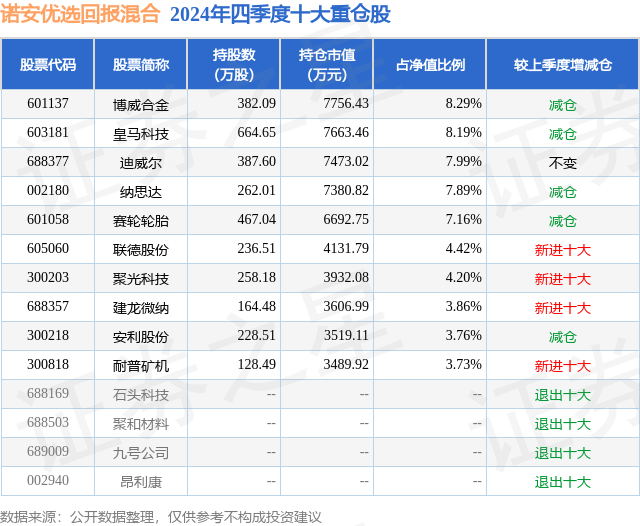 诺安优选回报混合的前十大重仓股如下: