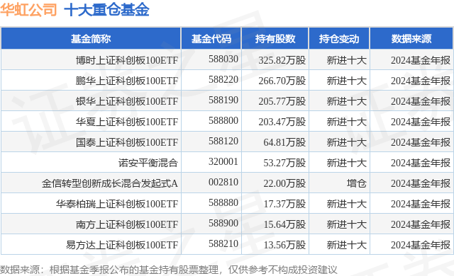 根据2024基金年报公募基金重仓股数据,重仓该股的公募基金共25家,其中持有数量最多的公募基金为博时基金的博时上证科创板100ETF。博时上证科创板100ETF目前规模为75.04亿元,最新净值0.9172(4月10日),较上一交易日上涨2.84%,近一年上涨17.06%。该公募基金现任基金经理为唐屹兵。唐屹兵在任的基金产品包括:博时可持续发展100ETF,管理时间为2022年7月22日至今,期间收益率为-6.54%;博时沪深300ETF,管理时间为2022年7月22日至今,期间收益率为-8.33%;博时红利ETF,管理时间为2022年7月22日至今,期间收益率为20.36%;博时上证科创板新材料ETF,管理时间为2022年9月30日至今,期间收益率为-44.89%。