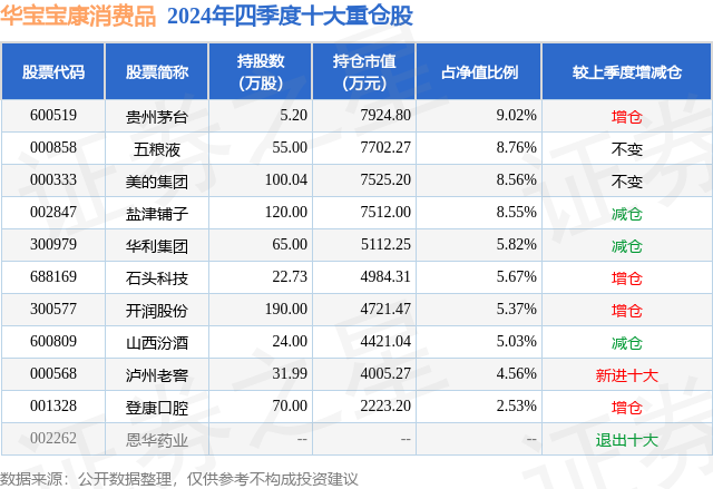 根据2024基金年报公募基金重仓股数据,重仓该股的公募基金共16家,其中持有数量最多的公募基金为华宝基金的华宝宝康消费品。华宝宝康消费品目前规模为8.79亿元,最新净值3.1061(4月11日),较上一交易日下跌0.62%,近一年下跌0.27%。该公募基金现任基金经理为汤慧。汤慧在任的基金产品包括:华宝成长策略混合A,管理时间为2020年5月9日至今,期间收益率为36.19%;华宝宝康配置混合,管理时间为2021年1月4日至今,期间收益率为-4.77%;