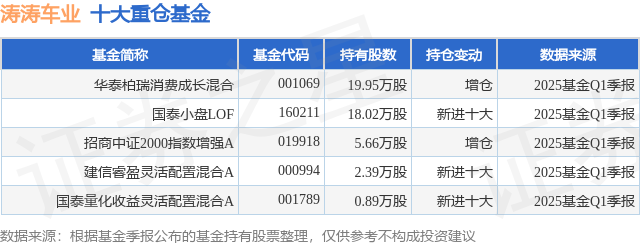 根据2025基金Q1季报公募基金重仓股数据,重仓该股的公募基金共5家,其中持有数量最多的公募基金为华泰柏瑞基金的华泰柏瑞消费成长混合。华泰柏瑞消费成长混合目前规模为1.75亿元,最新净值1.992(6月18日),较上一交易日上涨0.1%,近一年下跌15.63%。该公募基金现任基金经理为钱建江。