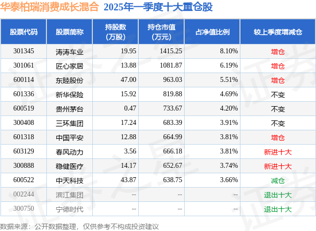 华泰柏瑞消费成长混合的前十大重仓股如下: