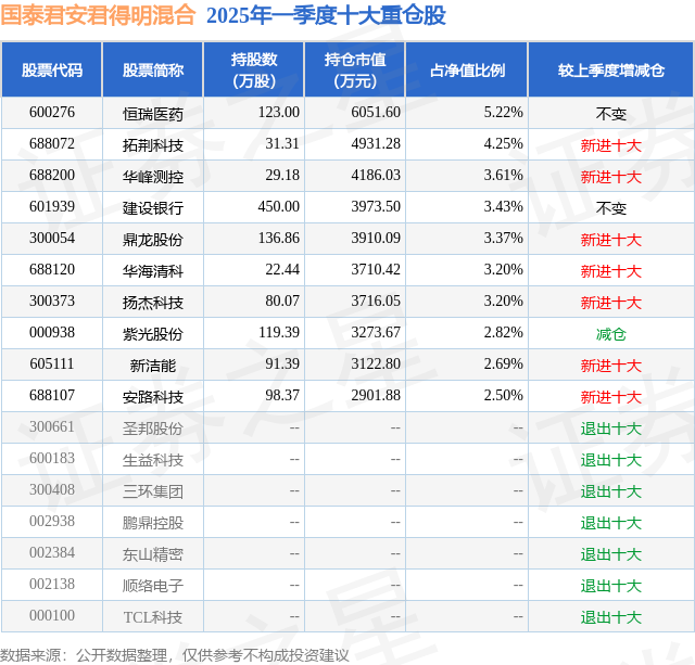 国泰君安君得明混合的前十大重仓股如下: