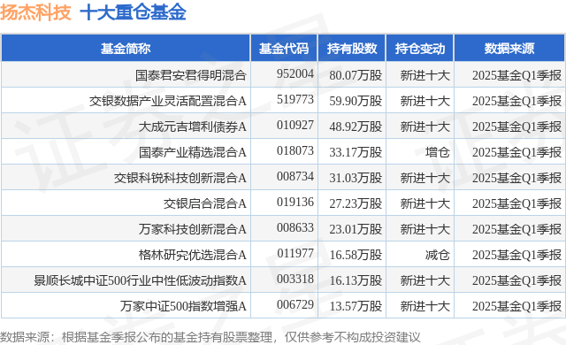 重仓扬杰科技的前十大公募基金请见下表: