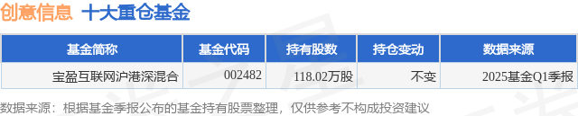 根据2025基金Q1季报公募基金重仓股数据,重仓该股的公募基金共1家,其中持有数量最多的公募基金为宝盈基金的宝盈互联网沪港深混合。宝盈互联网沪港深混合目前规模为2.88亿元,最新净值2.109(6月19日),较上一交易日下跌0.66%,近一年上涨13.88%。该公募基金现任基金经理为赵国进。赵国进在任的基金产品包括:宝盈资源优选混合,管理时间为2022年2月19日至今,期间收益率为-37.15%;