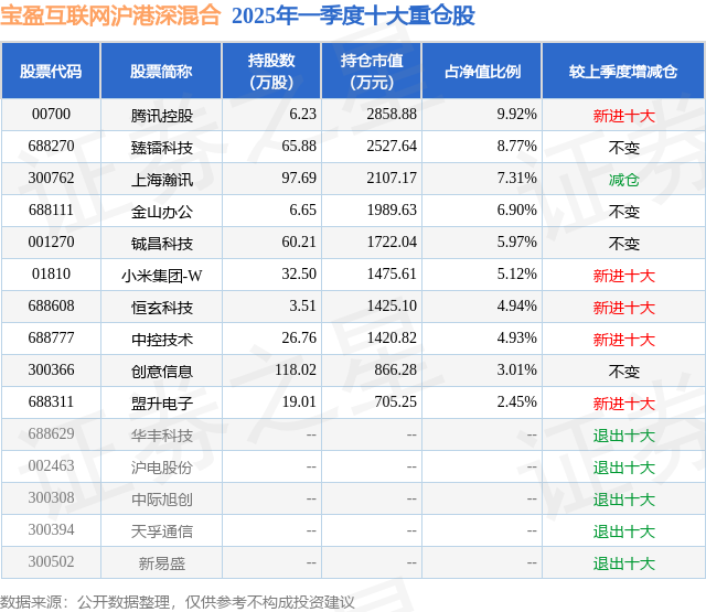 宝盈互联网沪港深混合的前十大重仓股如下: