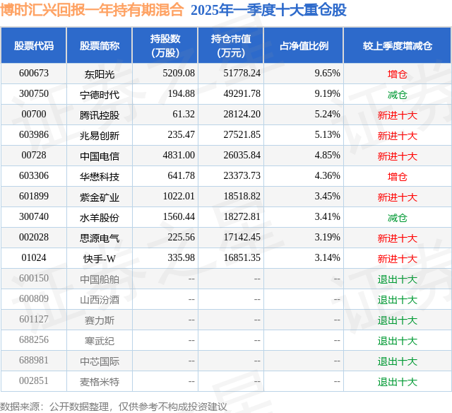 根据2025基金Q1季报公募基金重仓股数据,重仓该股的公募基金共1家,其中持有数量最多的公募基金为博时基金的博时汇兴回报一年持有期混合。博时汇兴回报一年持有期混合目前规模为53.66亿元,最新净值0.6978(6月20日),较上一交易日下跌0.71%,近一年上涨5.23%。该公募基金现任基金经理为吴渭。吴渭在任的基金产品包括:博时汇智回报灵活配置混合,管理时间为2017年4月12日至今,期间收益率为105.61%;博时汇荣回报混合A,管理时间为2021年8月24日至今,期间收益率为-22.46%。