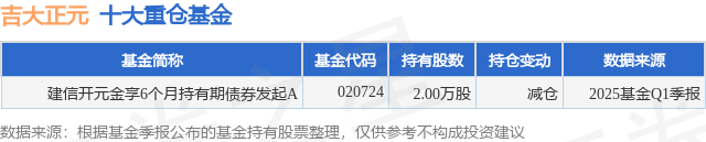 根据2025基金Q1季报公募基金重仓股数据,重仓该股的公募基金共1家,其中持有数量最多的公募基金为建信基金的建信开元金享6个月持有期债券发起A。建信开元金享6个月持有期债券发起A目前规模为0.58亿元,最新净值1.0275(6月20日),较上一交易日下跌0.09%,近一年上涨2.49%。该公募基金现任基金经理为袁蓓 江源。袁蓓在任的基金产品包括:建信鑫安回报灵活配置混合A,管理时间为2022年11月25日至今,期间收益率为5.79%;江源在任的基金产品包括:建信鑫安回报灵活配置混合A,管理时间为2022年11月25日至今,期间收益率为5.79%;