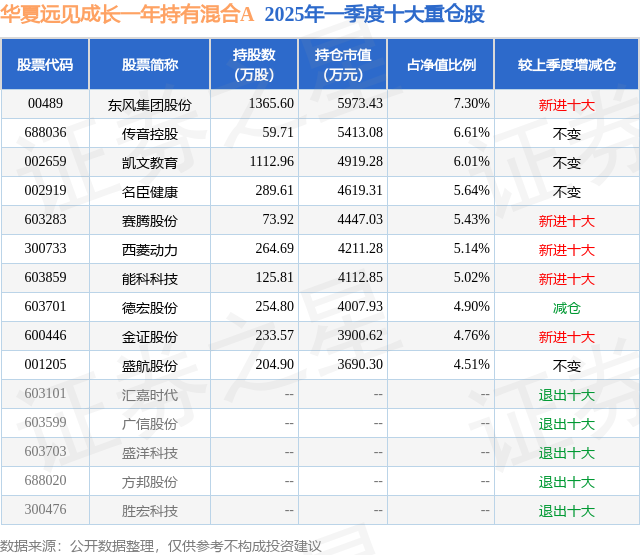 华夏远见成长一年持有混合A的前十大重仓股如下: