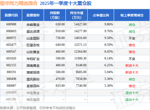 银华同力精选混合的前十大重仓股如下: