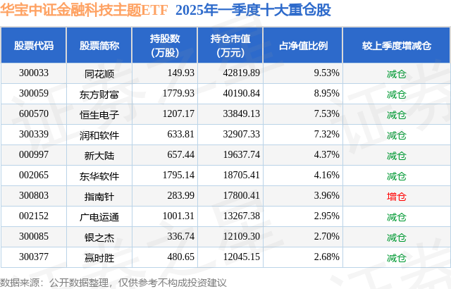 华宝中证金融科技主题ETF的前十大重仓股如下:
