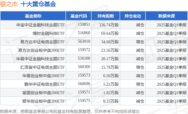根据2025基金Q1季报公募基金重仓股数据,重仓该股的公募基金共10家,其中持有数量最多的公募基金为华宝基金的华宝中证金融科技主题ETF。华宝中证金融科技主题ETF目前规模为44.93亿元,最新净值1.5131(6月23日),较上一交易日上涨4.35%,近一年上涨87.01%。该公募基金现任基金经理为陈建华。陈建华在任的基金产品包括:华宝中证A100ETF联接A,管理时间为2012年12月22日至今,期间收益率为125.45%;华宝化工ETF,管理时间为2021年2月26日至今,期间收益率为-41.06%;华宝有色金属ETF,管理时间为2021年3月12日至今,期间收益率为14.58%。