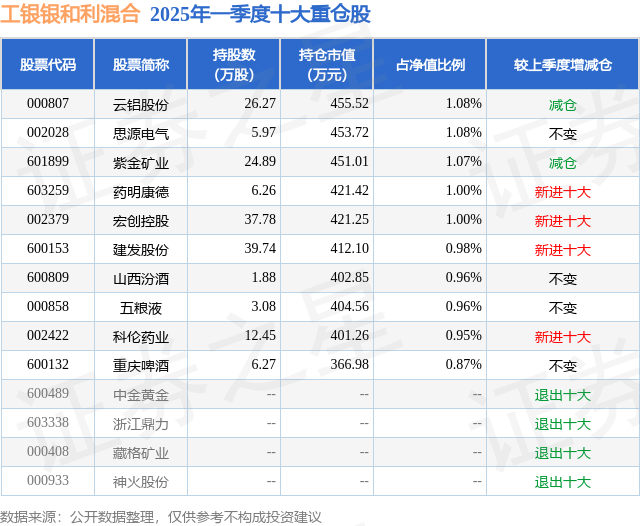 根据2025基金Q1季报公募基金重仓股数据,重仓该股的公募基金共11家,其中持有数量最多的公募基金为工银瑞信基金的工银银和利混合。工银银和利混合目前规模为4.2亿元,最新净值1.757(6月25日),较上一交易日上涨0.75%,近一年上涨13.14%。该公募基金现任基金经理为郭雪松。郭雪松在任的基金产品包括:工银丰收回报灵活配置混合A,管理时间为2019年9月16日至今,期间收益率为51.38%;工银添福债券A,管理时间为2021年2月25日至今,期间收益率为21.03%;工银泓裕回报混合,管理时间为2025年5月27日至今,期间收益率为nan%。