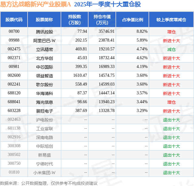易方达战略新兴产业股票A的前十大重仓股如下: