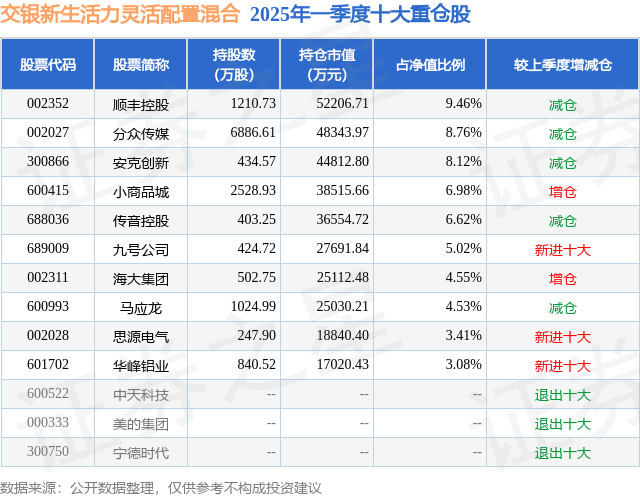 根据2025基金Q1季报公募基金重仓股数据,重仓该股的公募基金共72家,其中持有数量最多的公募基金为交银施罗德基金的交银新生活力灵活配置混合。交银新生活力灵活配置混合目前规模为55.2亿元,最新净值2.275(6月26日),较上一交易日下跌1.13%,近一年上涨12.79%。该公募基金现任基金经理为杨浩。