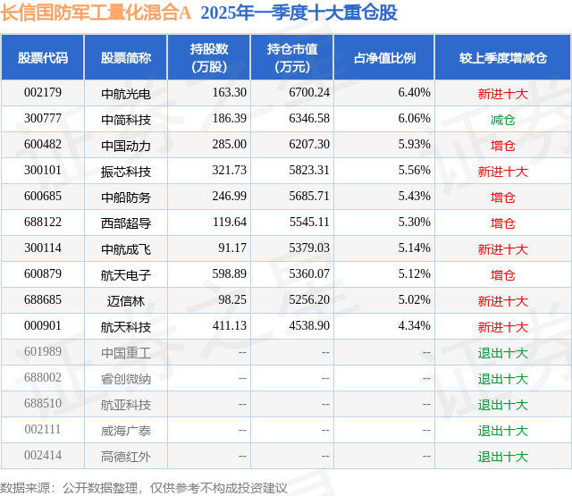 长信国防军工量化混合A的前十大重仓股如下: