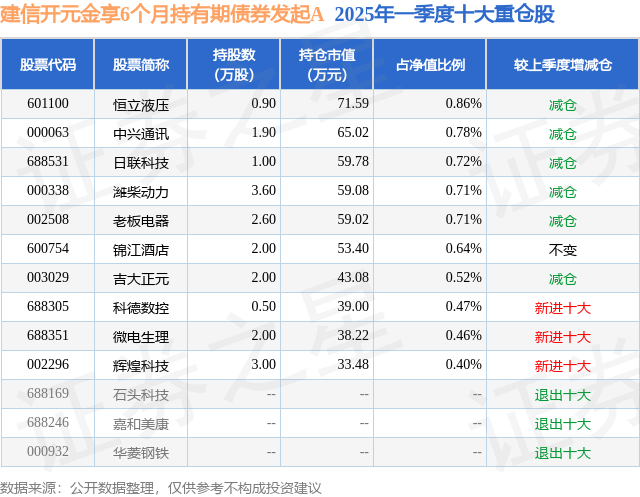 建信开元金享6个月持有期债券发起A的前十大重仓股如下: