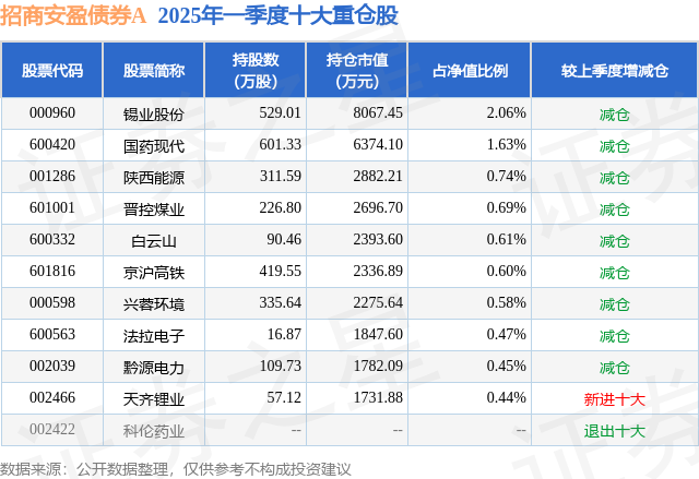根据2025基金Q1季报公募基金重仓股数据,重仓该股的公募基金共14家,其中持有数量最多的公募基金为招商基金的招商安盈债券A。招商安盈债券A目前规模为35.1亿元,最新净值1.1063(6月26日),较上一交易日下跌0.08%,近一年上涨2.58%。该公募基金现任基金经理为尹晓红 蔡振。尹晓红在任的基金产品包括:招商安庆债券,管理时间为2019年1月31日至今,期间收益率为31.49%;招商安阳债券A,管理时间为2020年11月4日至今,期间收益率为31.84%;招商瑞和1年持有期混合A,管理时间为2021年3月24日至今,期间收益率为13.26%。蔡振在任的基金产品包括:招商安阳债券A,管理时间为2021年8月5日至今,期间收益率为24.82%;招商中证1000指数增强A,管理时间为2021年11月5日至今,期间收益率为12.26%;招商安嘉债券,管理时间为2022年9月20日至今,期间收益率为21.55%。