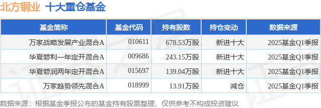 根据2025基金Q1季报公募基金重仓股数据,重仓该股的公募基金共4家,其中持有数量最多的公募基金为万家基金的万家战略发展产业混合A。万家战略发展产业混合A目前规模为8.99亿元,最新净值0.8534(6月26日),较上一交易日上涨0.83%,近一年下跌2.98%。该公募基金现任基金经理为叶勇。叶勇在任的基金产品包括:万家双引擎灵活配置混合A,管理时间为2018年8月24日至今,期间收益率为93.26%;万家北交所慧选两年定开混合A,管理时间为2021年11月23日至今,期间收益率为68.76%;万家周期驱动股票发起式A,管理时间为2023年10月31日至今,期间收益率为18.34%;万家趋势领先混合A,管理时间为2024年2月1日至今,期间收益率为22.15%。