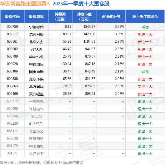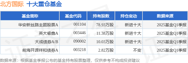 根据2025基金Q1季报公募基金重仓股数据,重仓该股的公募基金共4家,其中持有数量最多的公募基金为华安基金的华安新丝路主题股票A。华安新丝路主题股票A目前规模为3.95亿元,最新净值1.204(6月26日),较上一交易日下跌0.25%,近一年上涨0.33%。该公募基金现任基金经理为王春。王春在任的基金产品包括:华安宏利混合A,管理时间为2015年10月28日至今,期间收益率为20.99%;华安产业趋势混合A,管理时间为2022年8月3日至今,期间收益率为-34.57%;华安品质领先混合A,管理时间为2022年8月5日至今,期间收益率为-47.32%。