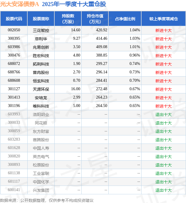 根据2025基金Q1季报公募基金重仓股数据,重仓该股的公募基金共1家,其中持有数量最多的公募基金为光大保德信基金的光大安泽债券A。光大安泽债券A目前规模为2.92亿元,最新净值1.1951(6月27日),较上一交易日下跌0.08%,近一年上涨8.41%。该公募基金现任基金经理为黄波。黄波在任的基金产品包括:光大中高等级债券A,管理时间为2019年10月9日至今,期间收益率为51.07%;光大安祺债券A,管理时间为2019年10月9日至今,期间收益率为26.4%;光大增利收益债券A,管理时间为2019年10月9日至今,期间收益率为43.15%;光大信用添益债券A,管理时间为2019年10月9日至今,期间收益率为66.02%。