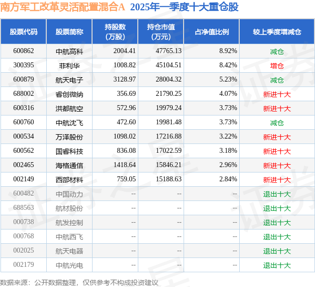 南方军工改革灵活配置混合A的前十大重仓股如下: