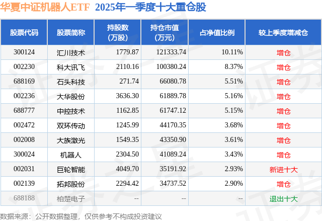 根据2025基金Q1季报公募基金重仓股数据,重仓该股的公募基金共61家,其中持有数量最多的公募基金为华夏基金的华夏中证机器人ETF。华夏中证机器人ETF目前规模为119.96亿元,最新净值0.839(6月27日),较上一交易日下跌0.2%,近一年上涨33.17%。该公募基金现任基金经理为华龙。华龙在任的基金产品包括:华夏饲料豆粕期货ETF联接A,管理时间为2022年8月22日至今,期间收益率为12.78%;华夏上证50AH优选指数A,管理时间为2022年8月22日至今,期间收益率为12.23%;华夏中证机器人ETF发起式联接A,管理时间为2023年5月31日至今,期间收益率为2.5%;华夏国证消费电子主题ETF发起式联接A,管理时间为2023年6月2日至今,期间收益率为19.63%。