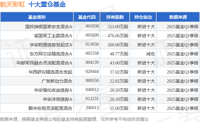 根据2025基金Q1季报公募基金重仓股数据,重仓该股的公募基金共13家,其中持有数量最多的公募基金为国投瑞银基金的国投瑞银国家安全混合A。国投瑞银国家安全混合A目前规模为20.23亿元,最新净值1.1368(6月27日),较上一交易日上涨0.62%,近一年上涨24.38%。该公募基金现任基金经理为李轩。