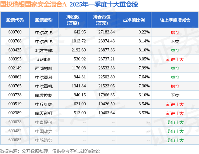 国投瑞银国家安全混合A的前十大重仓股如下:
