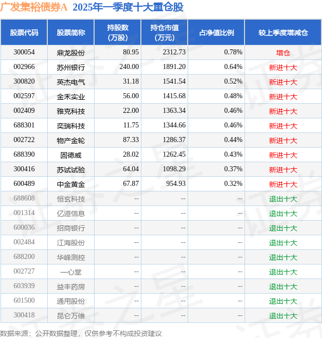 广发集裕债券A的前十大重仓股如下: